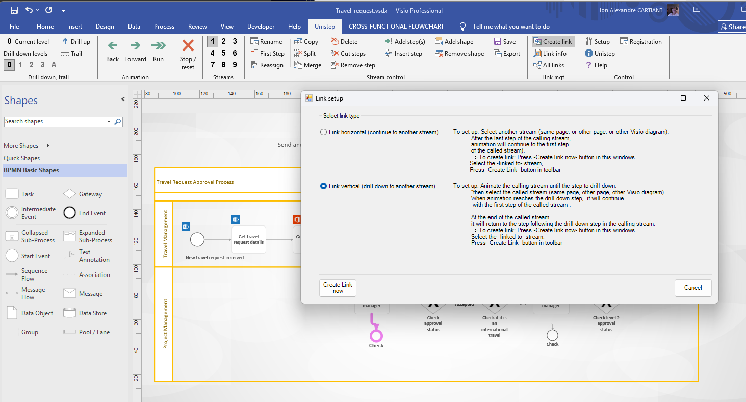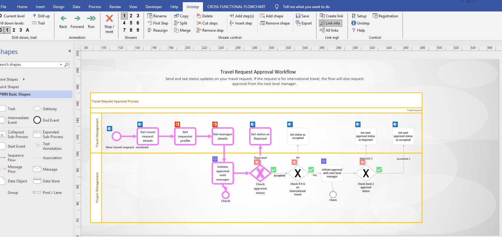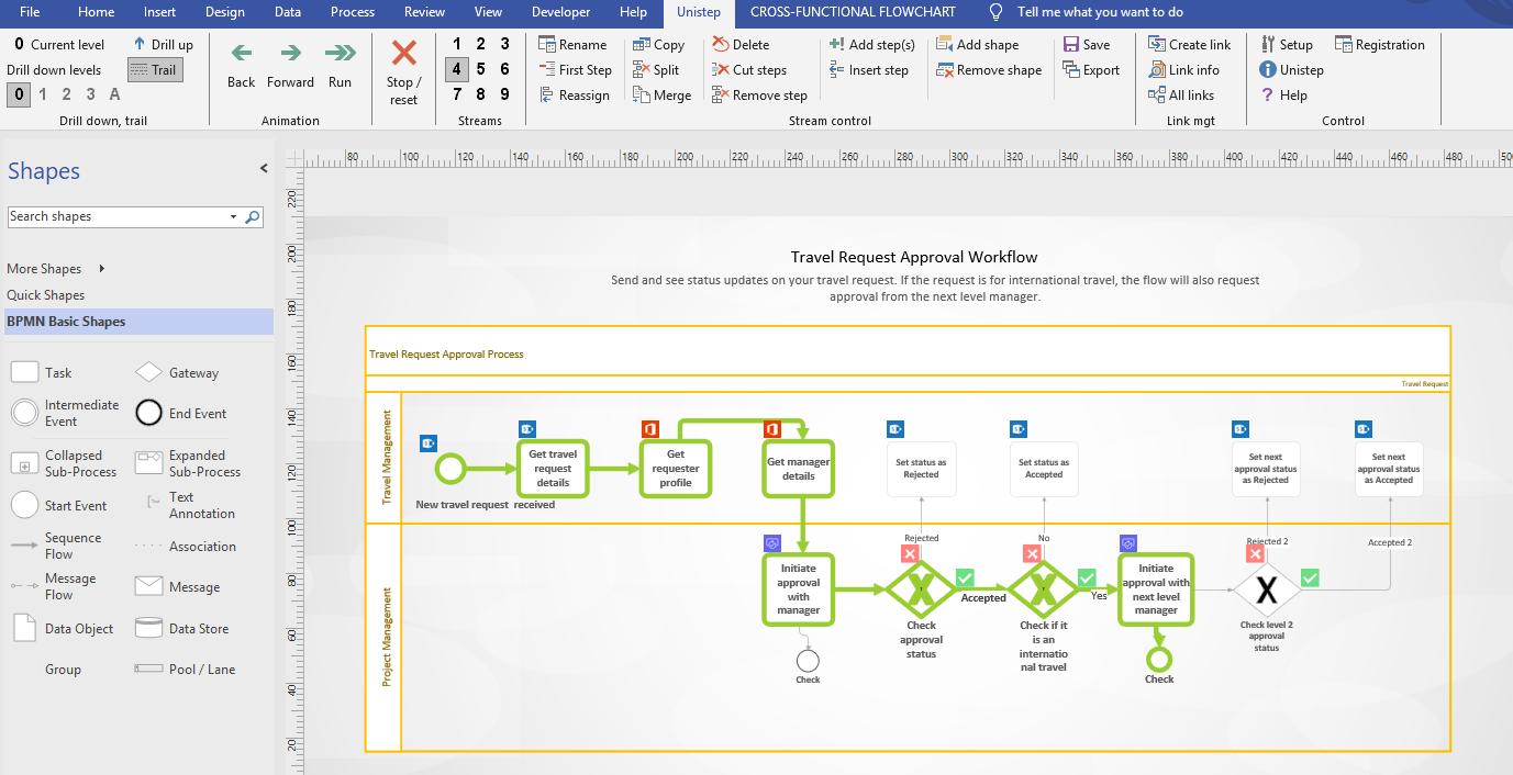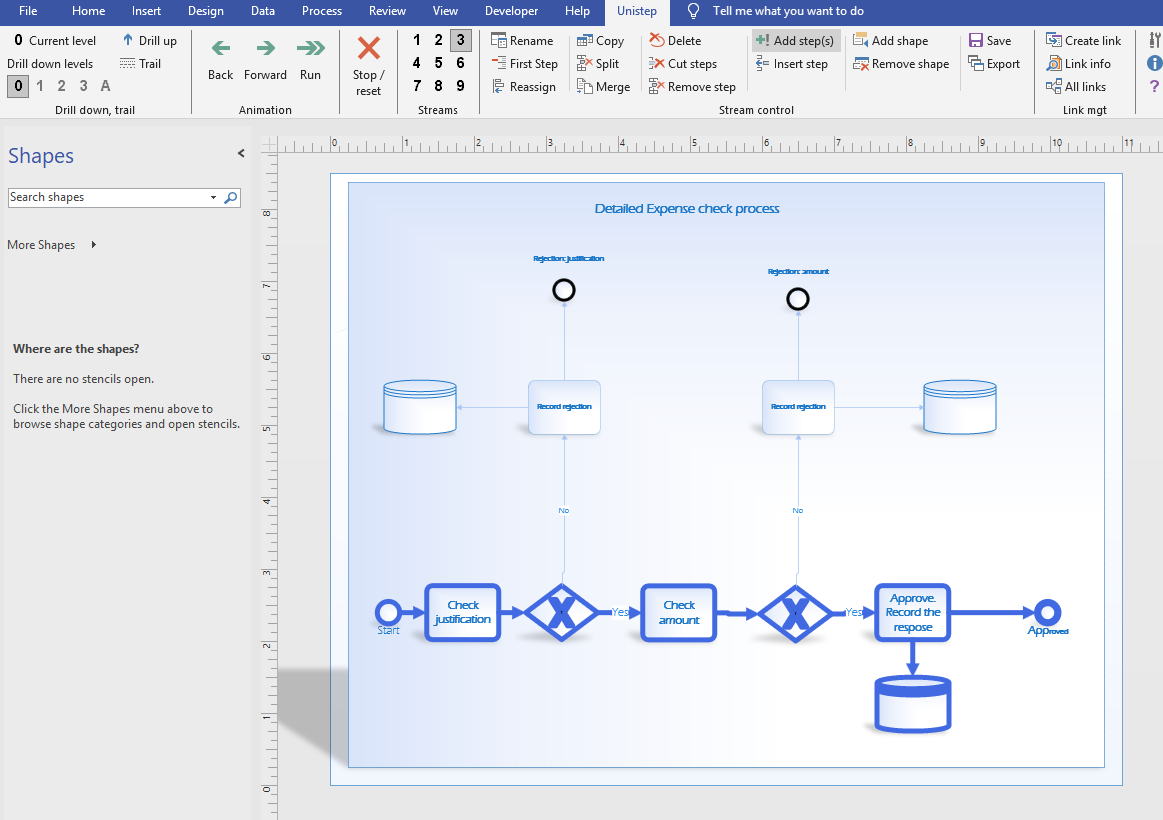 À partir d’un modèle Microsoft Visio, le premier analyste cartographie le processus global : « Demande refusée », « Demande approuvée », etc.
