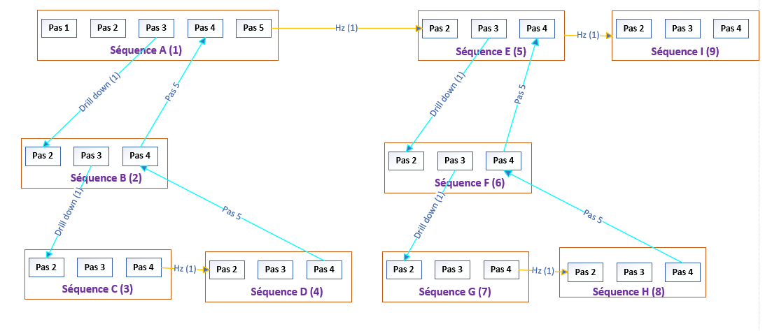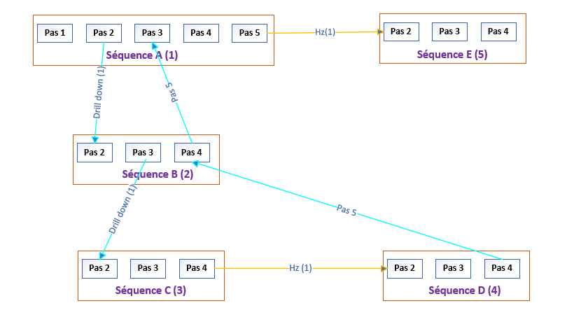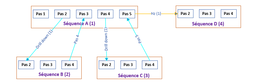 La séquence A appelle, à deux pas différents, deux autres séquences en mode drill-down. Lorsque la séquence A se termine, elle appelle une autre séquence via un lien horizontal.